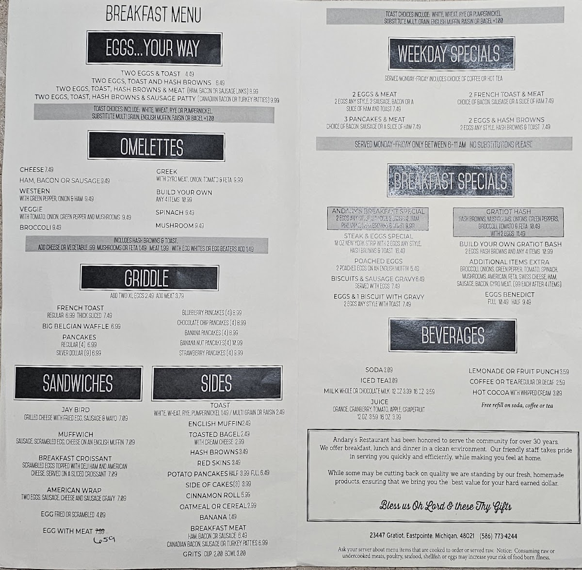 Welcome to Andary's Grill & Deli, a cherished gem located at 23447 Gratiot Ave, Eastpointe, MI. This delightful eatery promises a warm atmosphere and friendly service from the moment you walk in. Their menu is a celebration of hearty, home-cooked dishes that satisfy both the heart and the palate.